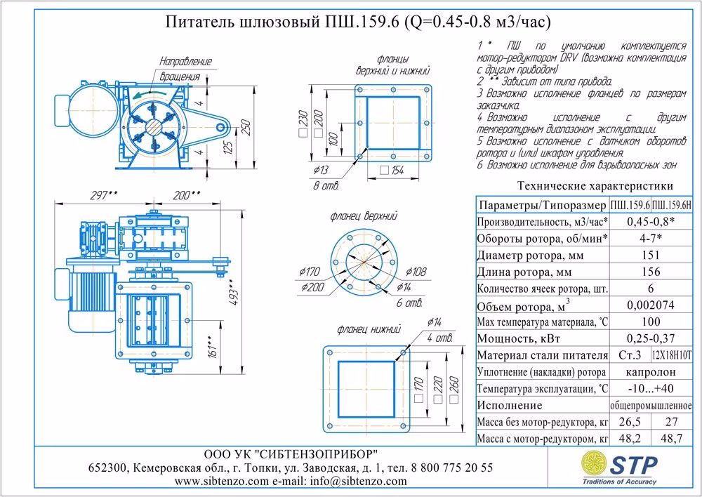 Все сборочные единицы и детали смонтированы в корпусе Питателя шлюзового 159.6. Рабочим элементом является ротор, с помощью которого происходит непрерывное (порционное) перемещение материала. Ротор установлен на подшипниковых узлах, которые расположены в крышках.